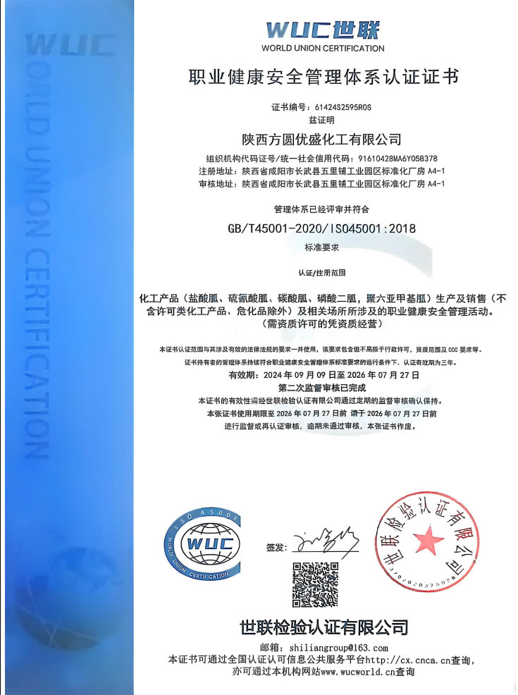 公司专注于胍盐类精细化工产品的研发、生产与销售,已依法取得环评、安全生产许可等全部资质,顺利通过 ISO9001质量管理体系,ISO14001环境管理体系、ISO45001职业健康安全管理体系三大权威认证。公司采用低温低压、绿色高效的小规模反应工艺,具备低污染、低能耗、安全可控的显著优势,已构建稳定成熟的生产体系,为产业链延伸与高端化工项目布局奠定坚实基础。
