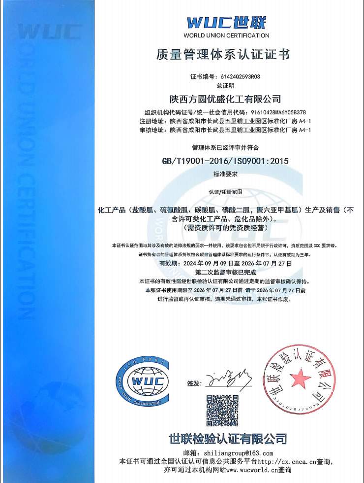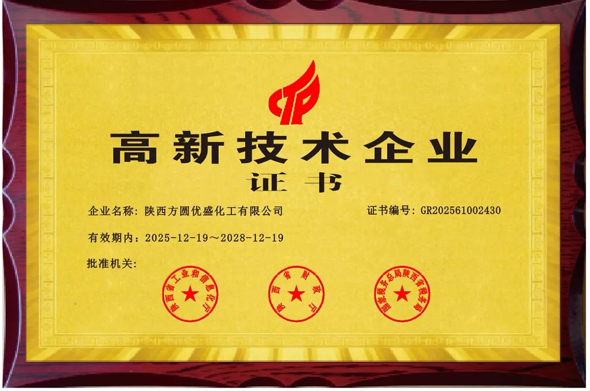 陕西方圆优盛化工有限公司是一家科技型中小企业(2024)、高新技术企业(2025)。公司成立于2021年04月30日,位于陕西省咸阳市长武县五里铺省级化工园区。经营范围包括一般项目:化工产品生产(不含许可类化工产品);化工产品销售(不含许可类化工产品);生物化工产品技术研发;日用化学产品销售;日用化学产品制造;专用化学产品销售(不含危险化学品);合成材料制造(不含危险化学品);货物进出口;技术进出口;进出口代理;贸易经纪;国内贸易代理(除依法须经批准的项目外,凭营业执照依法自主开展经营活动)等,企业品牌项目包括方圆优盛。